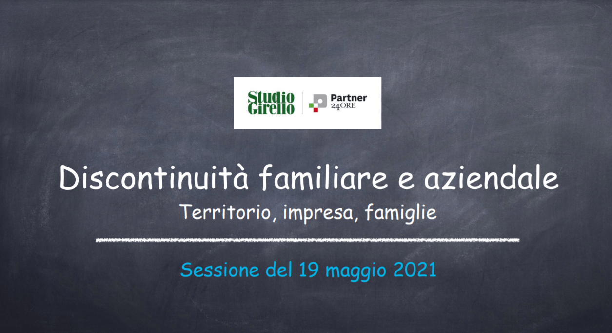 Si è svolto lo scorso 19 maggio, alle ore 12.00, il webinar dal titolo "Discontinuità familiare e aziendale: Territorio, famiglie, imprese". Relatori sono stati Cesare e Anna Girello dello Studio Girello....